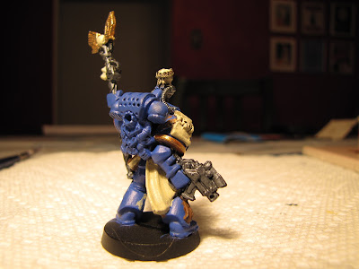 I started off by priming him with an undercoat of black and then thought about spraying him with another undercoat of navy blue, but decided there wasn't enough actual armor showing to warrant this. Instead, I would paint him entirely by hand. As you can see from the picture below, I'm not quite sure what I was thinking because at least half the model is clearly power armored. *facepalm*